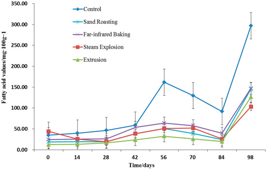 Fatty acid value is a sign to measure the content of free fatty acids in fat, and it can be used as an indicator of the degree of fat hydrolysis during storage. A low fatty acid value signifies that the degree of fat hydrolysis is small, and that the sample is fresh and not prone to rancidity [45]. Figure 5 portrays the changes of free fatty acids during the storage of whole grain HB flour. Compared with the control, except for steam explosion, the fatty acid values of whole grain HB flour after sand-roasting, far-infrared baking, and extrusion were significantly reduced (p < 0.05), at 18.8 mg/100 g, 24.33 mg/100 g, and 12.38 mg/100 g, respectively. This result indicated that thermal treatment exerted little effect on the fatty acid value of the whole grain HB flour.