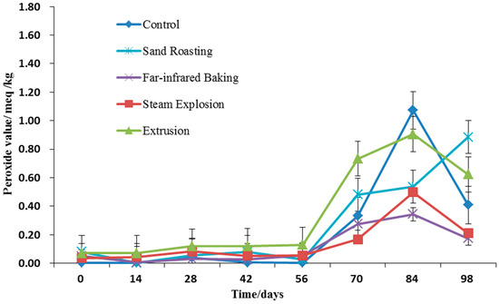 Under the same conditions, the storage time exerted a significant effect on the peroxide value of whole grain HB flour during storage (p < 0.05). With the extension of storage time, the fat of whole grain HB flour continued to undergo oxidative rancidity, and consequently, the peroxide value of whole grain HB flour gradually increased during storage (Figure 6), and increased sharply after 56 days of accelerated storage. The peroxide value of whole grain HB flour after extrusion and sand-roasting changed greatly in the accelerated storage process, and the peroxide values after steam explosion and far-infrared baking were relatively stable in the accelerated storage process. This indicates that the whole grain HB flour treated by extrusion and sand-roasting was unstable during storage, while the whole grain HB flour treated by steam explosion and far-infrared baking was relatively stable during storage.