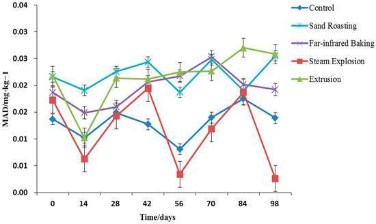 With the oxidation of fat, the peroxide produced will degrade and the peroxide value will drop, yet the malondialdehyde value will continue to increase. Consequently, the malondialdehyde content may better reflect the oxidation degree of fat [46]. Figure 7 indicates the change law of malondialdehyde value of whole grain HB flour during storage. Compared with the control, with the increase of storage time, the malondialdehyde value of whole grain HB flour after different thermal treatments fluctuated greatly. In general, it demonstrated an increasing trend, which was consistent with the above change trend of fatty acid value and peroxide value. It was fully demonstrated that the cooked whole grain HB flour after thermal treatment had oxidative rancidity of fat during storage, and the fat oxidation became more apparent with the increase of storage time. Specifically, the malondialdehyde value of whole grain HB flour treated by extrusion and sand-roasting maintained a high level during storage, at 0.0102–0.0270 mg/kg and 0.019–0.2055 mg/kg, respectively, followed by far-infrared baking and steam explosion. This result revealed that the whole grain HB flour treated by extrusion and sand-roasting exhibited a serious degree of fat oxidation and rancidity during storage, and thus was unstable during storage, while the whole grain HB flour treated by steam explosion was relatively stable during storage.