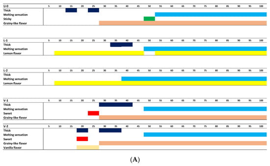 In order to familiarize the panelists with the TDS method, a warm-up session with oat-based yogurt was organized in the last training session. TDS questions were asked after the GDA. In total, seven attributes, including thickness, stickiness, melting sensation, sweetness, grain-like flavor, vanilla flavor, and lemon flavor, were included in the TDS. Panelists were instructed to evaluate the samples’ sensory properties and select the term that caught their attention at each moment of the evaluation [43]. They were instructed to consume the sample for at least 5 s and no more than 30 s. The software showed the clock during the evaluation.