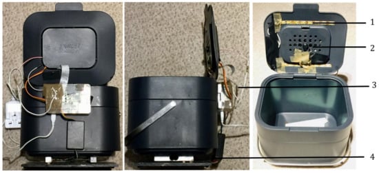 The smart bin. The smart bin is comprised of a 4-liter caddy with dimensions 23.5 × 19.7 × 16.1 cm. In the lid is a light bar (1) and a motion sensitive camera (2), that when the lid is lifted is programmed to take 6 photos. These are wired to a mains-powered, Raspberry Pi single board computer (3). This is connected to the household Wi-Fi and data is recorded remotely. Finally, the Raspberry Pi signals a set of weighing scales (4) to record the weight of the bin each time the lid is opened.