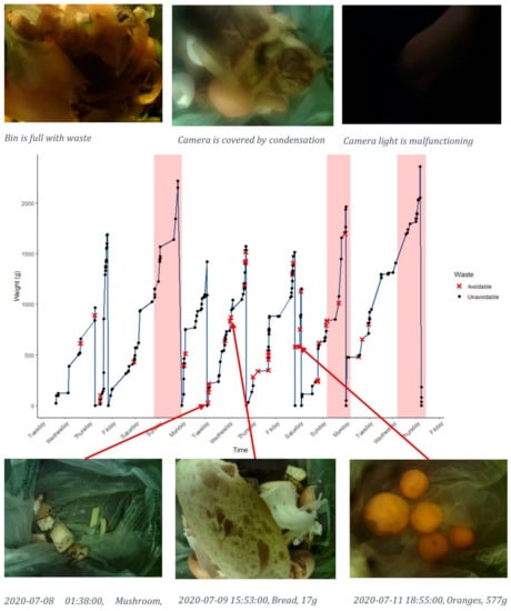 Among the avoidable items were mushrooms, bread and oranges, as shown in the pictures below. The pictures are examples of the raw data; however, participants were only provided with the item description, time stamp and weight. The left and right images show ideal cases where items are introduced to an empty bin, whereas the central bread image shows how items may become mixed and difficult to identify. While the bin does not reveal who is exactly responsible for the waste, it does show when, what and how much was wasted.