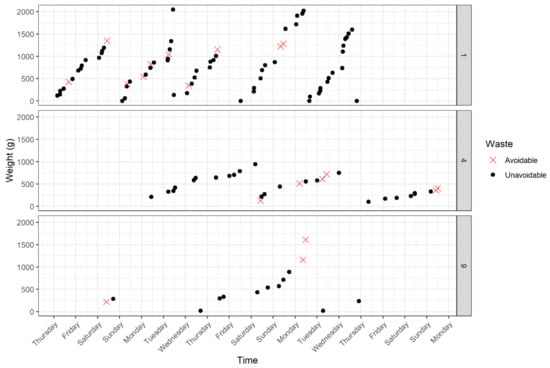 These patterns are further explored in Figure 4, selecting households 1, 4 and 9 to reveal the observable differences and similarities between them. Each household routine is unique, and their regularity reflects their configuration. Household 1 has five persons, resulting in quick filling and emptying of the bin, five times over two weeks. Household 4 with two persons fills the bin three times, at a much lower amount but with similarly uniform peaks and troughs. Household 9 seems to use the bin regularly for one week, then sporadically around that. The bin is filled and emptied systematically, at similar weights and intervals. Avoidable items, however, are irregular, sometimes together and in small amounts; at others, infrequent and large, irrespective of other factors. Intra and inter household variation in wasting is significant, revealing a consistency in overall weight but disorder among avoidable items. While this speaks to the granularity of household practices and human behaviour, as of yet, little can be said about mitigating avoidable waste, not revealing any specific rationale with the data.