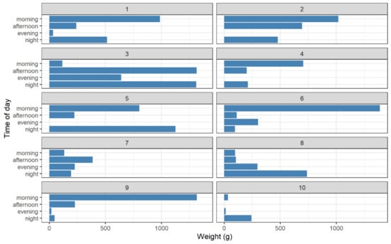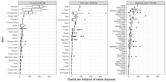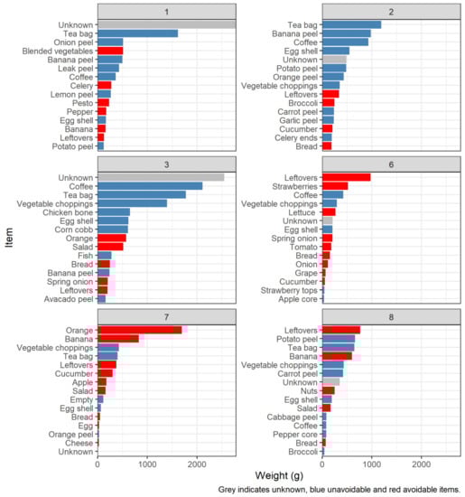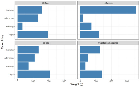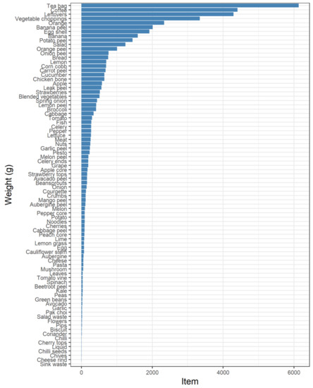 The bin reveals a range of waste products; however, the sample is significantly skewed toward a small number of them. Figure 5 shows the accumulated weights of all the items across the sample. The most wasted items by weight were tea bags, followed by coffee and leftovers. This is unsurprising as tea and coffee necessarily produce waste, and the by-products are rarely consumed in the current sample. Their waste produced is presumed to be directly related to the amount of tea or coffee consumed, unlike leftovers or other avoidable wastes that can be more easily assigned to human mismanagement. It is expected that these items may also be biased by the sample context, being rural UK households, and that these items may be different in a different area. Equally, the level of balance in diet may be greater or lesser depending on cultural or ecological context. Tea and coffee are also frequently disposed of directly from a liquid, having been brewed in hot water, which adds considerable weight to the product.
