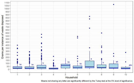 The cost of food emphasises this point, revealing a further disjuncture between items, weights and individuals. The UK national average of avoidable food waste per week as of 2018 was 1330 g at GBP 4.04 per capita and 3170 g at GBP 9.62 per household []. However, this sample is considerably lower than their estimates according to weight, with costs ranging from GBP 2.80 to GBP 14.26; 6 and 9 produce significantly greater costs. Initial patterns indicate that while the single household with children has significantly more avoidable waste, the financial value of that waste is much lower than in the homes of just two adults. Equally, larger households, with greater amounts of total waste, proportionately produce much lower waste in terms of monetary value.