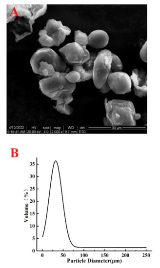 The formation of Pickering emulsion is affected by many factors, such as the shapes, sizes, wettability and concentrations of solid particles, the pH, the ionic strength of the aqueous phase, the properties and volume fraction of the oil phase, etc. [19,20], in which the particle emulsifier is generally measured in nanometers or microns. Therefore, we investigated the appearance and size distribution of the sorghum flour particles. As shown in Figure 1, most of the particles were spherical and oval, and a few were irregular; the particle size was in the range of 0.3–75 μm, showing a unimodal pattern with the median diameter of 21.47 μm. It is reported that the droplet size of Pickering emulsions stabilized by starches is 1–100 μm [8], so the size of the sorghum flour meets the requirements, and it has the potential to stabilize Pickering emulsions.