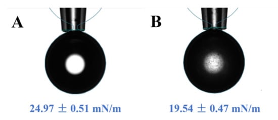 The effect of sorghum flour on the interfacial tension between MCT and water (A: control; B: sorghum flour).