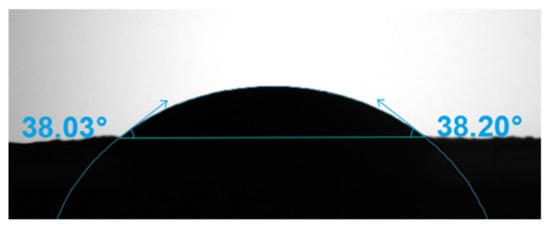 The Pickering emulsifying ability of particles is closely related to the wettability of particles, which allows particles to aggregate spontaneously at the oil–water interface and maintain the aggregation through volume exclusion and spatial hindrance [21]. The wettability of particles can be evaluated by reducing the oil/water interfacial tension and contact angle [20]. As shown in Figure 2, compared with the control (24.97 ± 0.51 mN/m), the sorghum flour could significantly reduce the oil/water interfacial tension (19.54 ± 0.47 mN/m). Although the main component of the sorghum flour was starch, it still contained a certain amount of natural emulsifiers, such as lipids and proteins, which could lead to the reduction of the oil/water interfacial tension. Previous studies have also shown that starch has the ability to stabilize Pickering emulsions when combined with proteins or lipids [22,23]. The contact angle can reflect the wetting effect of solid particles in oil and water phases. For spherical particles, when 15° < θ < 90°, it can stabilize O/W Pickering emulsions [20]. In this study, the contact angle of the sorghum flour was 38° (Figure 3). Combined with the interfacial tension analysis, it indicated that the sorghum flour had certain wettability and could stabilize the fabrication of O/W Pickering emulsions.