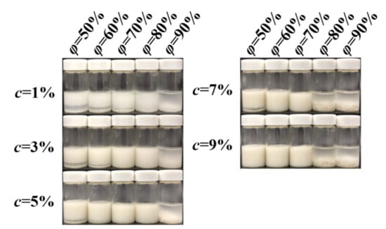 In order to evaluate the feasibility of fabricating Pickering emulsion gels with sorghum flour, the effects of c (1–9%) and φ (50–90%) on the formation of the emulsion gels were investigated. As shown in Figure 4, when φ = 50%, Pickering emulsion gels could not be obtained in the experimental c range; when φ = 60%; the gel could only be developed at c = 9%; when φ = 70%, Pickering emulsion gels could be formed at c = 5, 7 and 9%. When φ = 80 or 90%, the emulsion was stratified. For purpose of revealing the corresponding formation mechanism, the Pickering emulsion gels developed at φ = 70% and c = 5, 7 and 9% were selected for the follow-up experiments.