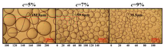 A total of 20 μL of the emulsion gel developed at φ = 70%, c = 5, 7, 9% was deposited onto a slide and observed by a BH200P polarizing microscope (Shanghai Sunny Hengping Scientific Instrument Co., Ltd., Shanghai, China). The droplet size was analyzed in ImageJ software (National Institutes of Health, Bethesda, MD, USA) based on a published method [16].