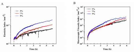 Microrheology is a rheological technique based on diffusion spectroscopy (DWS) that can reflect rheological behavior without mechanical shear [25]. In the process of measurement, the CCD probe tracks the Brownian motion of the particles by a coherent laser emitted into the emulsion. The obtained EI and MVI correspond to G′ and G″ in the traditional mechanical rheology, respectively, reflecting the elasticity and viscosity of the system [26,27]. Here, the EI and MVI of all samples increased gradually with time (Figure 7), which was due to the viscosity effect caused by starch. In addition, the EI and MVI of the samples were positively correlated with c, and the EI of the emulsion gel developed at φ = 70% and c = 5% fluctuated greatly, indicating that the gel was weak; this was consistent with the results of microscopic observation and the gel strength analysis. At 6 h, EI and MVI were positively correlated with the gel strength, with r2 of 0.9370 and 0.9469, respectively, indicating that the microrheological results and the gel strength were mutually confirmed.