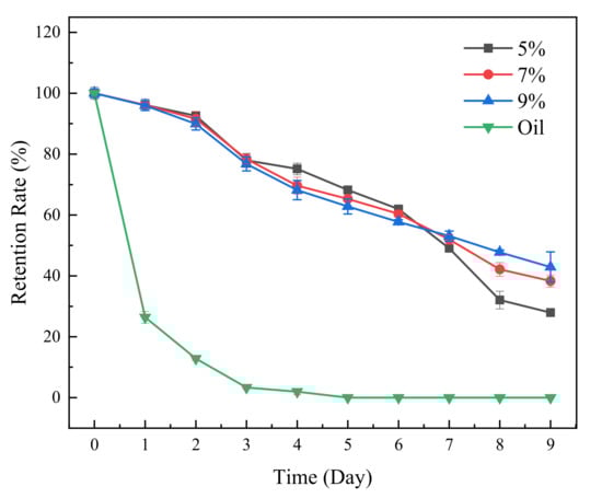 β-Carotene is a common vitamin A supplement with the function of improving vision, but its application is limited because of its unstable exposure to oxygen, heat and light [28]. In this study, the β-carotene protective capacity of Pickering emulsion gels stabilized by sorghum flour against UV irradiation was evaluated. Figure 8 displays the effect of c on the β-carotene retention rate. Compared with MCT, the Pickering emulsion gel stabilized with sorghum flour had obvious protective effects on loaded β-carotene. On the 3rd day after UV irradiation, the β-carotene retention rate in MCT was close to zero, while the β-carotene retention rate of the Pickering emulsion gel was still higher than 75%. On the 9th day, the β-carotene retention rates of the Pickering emulsion gel with c = 7% and 9% were similar and significantly higher than that of the Pickering emulsion gel with c = 5%, indicating that c was positively correlated with β-carotene retention. The mechanism of protecting β-carotene using Pickering emulsion gels stabilized with sorghum flour may be as follows: (1) The sorghum flour adsorbed on the O/W interface forms a shell structure that weakens the exposure of UV to β-carotene in MCT; (2) the sorghum flour contains a small amount of tannins [29,30], which have UV absorption and help to improve the protective effect of β-carotene.