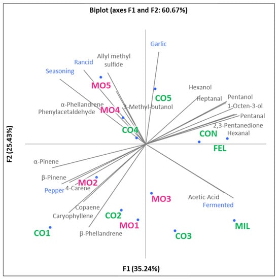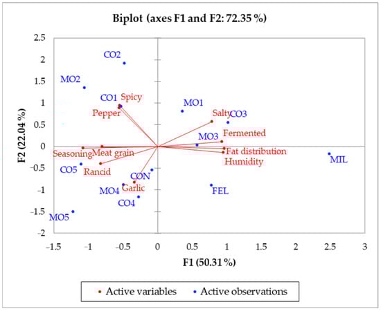 Principal component analysis (PCA) biplot for the sensory results. Samples were coded as CO1 (conventional salami with small size), MO1 (Mora Romagnola salami with the same size as CO1), CO2 (conventional salami of “Nostrano” type), MO2 (Mora Romagnola salami similar to CO2), CO3 (conventional salami of “Cacciatore” type), MO3 (Mora Romagnola salami similar to CO3), CO4 (conventional salami obtained directly from a local producer), MO4 (Mora Romagnola salami similar to CO4), CO5 (conventional salami obtained directly from a local producer), MO5 (Mora Romagnola salami similar to CO5), CON (conventional salami of “Contadino” type), FEL (conventional salami of “Felino” (PGI) type), and MIL (conventional salami of “Milano” type).