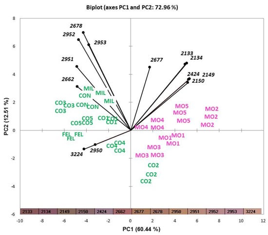 The characteristic color of salami depends on the interaction between meat pigments and products resulting from the reduction of added nitrates and nitrites. After nitrate reduction to nitrites, the latter are reduced to nitric oxide, which reacts with myoglobin, reducing it into chromogen []. This process improves color stability; nonetheless, salami is a very complex product in which pigment oxidation is difficult to investigate due to the numerous factors affecting the redox potential []. Image analysis allowed the color spectrum of each sample to be obtained in RGB coordinates (red, green, blue). The analysis is carried out rapidly, with easy-to-use equipment, thus being potentially useful also for quality control, given that no sample preparation is required. The use of a spectrophotometer tool that gives the CIE L*a*b* coordinates could be a good alternative. The color spectra were composed of more than 100 ranges of red, each identified by a specific numerical code. To evaluate its ability in discriminating the different categories of salami, data collected by electronic eye were processed by PCA. A selection of the most discriminant variables was carried out, to improve the separation between samples. Only 13 of the colors were selected according to their contribution to the two principal components (PC1 and PC2) that explained the variance (data not shown) and used as variables to perform a PCA. The projection of the samples in the factorial plane is reported in Figure 2. The different directions and locations of vectors (PCA loadings) show which variables (colors) were involved in appearance variation among the samples. The 13 colors selected allowed the two types of salami to be distinguished, highlighting the fact that the Mora Romagnola samples were darker shades of red. In fact, they are positioned in quadrant 1 (samples MO2, MO4, and MO5 are in the upper-right quadrant) or in quadrant 2 (samples MO1 and MO3 are positioned in the lower-right quadrant), while conventional salami are positioned in quadrants 3 and 4, with the exception of sample CO2, which was characterized by a similar color to samples MO3 and MO1.