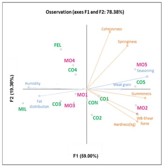 The sensory profiling results (Table 3) showed that the intensities of the attributes seasoning and fermented for samples CO1 vs. MO1 and CO2 vs. MO2 were significantly different. For these samples, it could be useful to describe salami produced with different pig breeds, although they are not associated with a specific breed. Additionally, a significant difference related to the perception of humidity was also registered for MO1 compared to CO1, where the latter showed a higher intensity for this descriptor. Overall, the sensory evaluation was more useful in revealing differences among the different types of salami than in highlighting differences related to the breed. Considering the market leaders CON, FEL, and MIL, the latter had remarkably different characteristics and showed the highest intensities of pepper, garlic, fermented, spicy, salty, humidity, and fat distribution and the lowest intensities of seasoning, rancid, and meat grain, which is probably related to its processing [].