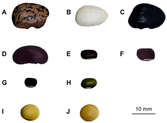 - Kaga, A.; Ishii, T.; Tsukimoto, K.; Tokoro, E.; Kamijima, O. Comparative molecular mapping in Ceratotropis species using an interspecific cross between azuki bean (Vigna angularis) and rice bean (V. umbellata). Theor. Appl. Genet. 2000, 100, 207–213. [Google Scholar] [CrossRef]