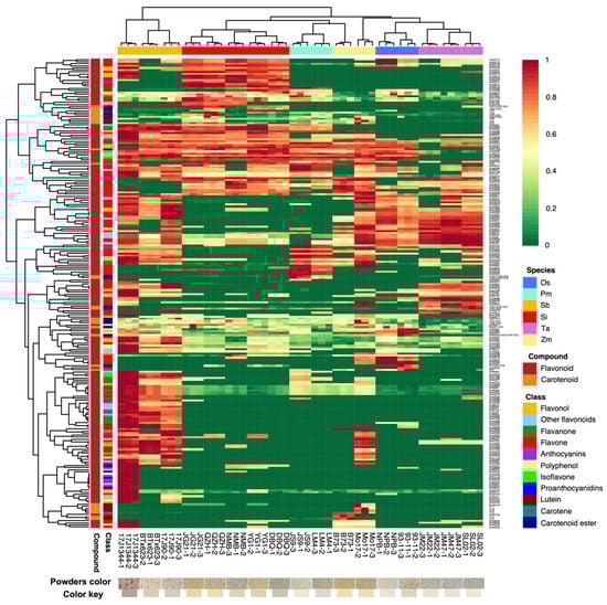 In this study, 114, 128, 101, 179, 113 and 92 flavonoids were identified in wheat (Ta), maize (Zm), rice (Os), sorghum (Sb), foxtail millet (Si), and broomcorn millet (Pm), respectively (Figure 3A). The annotation of flavonoids metabolite shows at supplementary Table S3. Some of them existed in grains of all the six Poaceae crops with considerable content (>19 ug/g), such as pme2977 (trihydroxyethyl rutin), pmb3894 (di-O-methylquercetin), pmc1990 (4′-hydroxy-5,7-dimethoxyflavanone) and pmf0458 (6-gingerol). However, there were also species-specific compounds. For instance, three flavonoids including pma0779 (Tricin O-rhamnosyl-O-malonylhexoside), pma6371 (di-C,C-hexosyl-luteolin) and pmf0614 (Peonidin 3,5-diglucoside chloride) were detected only in Si. Sb harbored 21 flavonoids which were not identified in other crops tested. Only one specific flavonoid for each species was determined in Os (pmb0678, 8-C-hexosyl-apigenin O-feruloylhexoside), Pm (pmb0620, Chrysoeriol 6-C-hexoside 8-C-hexoside-O-hexoside) and Zm (pmb0732, Tricin 5-O-feruloylhexoside) and no specific one existed in Ta (Figure 3A). Additionally, several carotenoids were identified in Ta (15), Zm (18), Os (21), Sb (17), Si (22) and Pm (12) (Figure 3B). The record of carotenoid metabolites is shown in supplementary Table S4. As expected, there are also the species-specific carotenoids. vio(C14:0/C16:0, violaxanthin-myristate-palmitate) and lut(C16:0/C16:0, lutein dipalmitate) were only found in Pm and Ta, respectively. Interestingly, the minor crops did not produce specific carotenoids. However, these results showed that coarse grains (Si, Pm, Sb) probably contained more specific flavonoids than staple crops (Os, Zm, Ta), whereas staple crops showed more specific carotenoids than coarse grains.