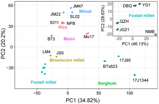 Two principal components, PC1 and PC2, represented a 34.82% and 20.2% contribution to the differences among species, respectively, and separated the six species distinctly (Figure 2). Moreover, PC1 and PC2 also revealed the differences among varieties of each species with good repeatability. The six Poaceae crops varieties were separated clearly. In addition, the staple crops (including Rice, wheat, and maize) got similar scores and were significantly separated from the minor crops (including sorghum, foxtail millet, and broomcorn millet). For instance, the 9311 and NPB rice showed slight differences on either PC1 or PC2 dimension, whereas the B73 and Mo17 maize, LM4 and JS9 broomcorn millet were distinguished mainly by PC1. Three varieties of wheat or sorghum displayed diversity on both dimensions. Five varieties of foxtail millet with disparities in edible quality were analyzed in the inner graph. The contribution rates of PC1 and PC2 explained 46.13% and 28.63%, respectively. JG21 and QZH with high eating-quality were similar on the PC1 dimension and so did DBQ and YG1 on PC2 dimension. As expected, the unpalatable cultivar NMB was far away from the four varieties.