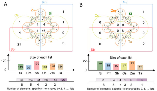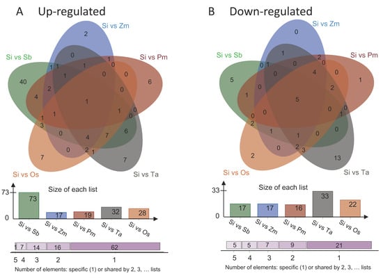 Venn diagram showing the overlapping and accession-specific differential metabolites. (A) Up-regulated; (B) Down-regulated.