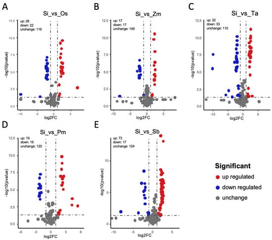 Identification of differential metabolites for five comparison groups (A) Si vs. Os, (B) Si vs. Zm, (C) Si vs. Ta, (D) Si vs. Pm, (E) Si vs. Sb. Differential metabolites plotted as a volcano. A metabolite is represented by each point on the graph. Up-regulated metabolites are represented by red dots, down-regulated metabolites are represented by blue dots, and metabolites with insignificant differences are represented by black dots.