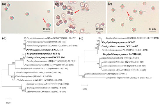 Cell morphology of P. cruentum CCALA-415 (a), P. purpureum SCS-02 (b) and P. purpureum FACHB-806 (c). Phylogenetic tree based on 18s rDNA gene sequence (d) and internal transcribed spacer regions (e) of the three strains of Porphyridium.