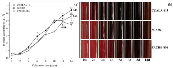 As shown in Figure 2a, the growth trends of the three strains of Porphyridium were different. From day 0 to day 4, there was no significant difference in the biomass concentration. From day 4 to day 10, SCS-02 had a higher biomass concentration compared to CCALA-415 and FACHB-806. After day 10, the growth rates of CCALA-415 and FACHB-806 slowed down, while that of SCS-02 was not affected. The highest biomass concentrations of CCALA-415, SCS-02 and FACHB-806 were 4.84 g L−1 (day 12), 6.43 g L−1 (day 14) and 5.60 g L−1 (day 14), respectively. During the culture period, the color of CCALA-415, SCS-02 and FACHB-806 in the photobioreactors changed from light red (day 0) to dark red (day 8) and then to reddish brown (day 14) (Figure 2b). CCALA-415 had the fastest color change from light red to dark red, followed by SCS-02 and FACHB-806.