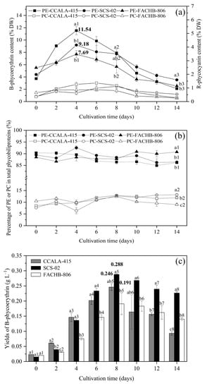 On day 8, the phycoerythrin yields of CCALA-415, SCS-02 and FACHB-806 reached the highest levels (Figure 3c). The phycoerythrin yield of SCS-02 was 0.288 g L−1, which were 15% and 34% higher than that of CCALA-415 and FACHB-806, respectively. From day 8 to day 14, the yields of phycoerythrin of CCALA-415, SCS-02 and FACHB-806 decreased by 62%, 21% and 27%, respectively. Therefore, the yield of phycoerythrin of SCS-02 was significantly higher than that of CCALA-415 and FACHB-806 (p < 0.01) on day 14.