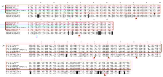 Amino acid sequence alignment of α subunit (a) and β subunit (b) of phycoerythrin from CCALA-415, SCS-02 and FACHB-806. PP: Porphyridium purpureum; PC: Porphyridium cruentum; PS: Porphyridium sordidum; NH: Neopyropia haitanensis; NY: Neopyropia yezoensis. Black shading indicates completely different amino acids; gray shading indicates similar amino acids; the label ▲ is the position where the subunit is attached to the chromophore.