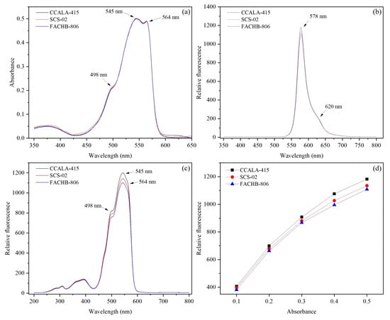 In Figure 5b, CCALA-415, SCS-02 and FACHB-806 had similar fluorescence emission spectrum, with the main fluorescence peak at 578 nm and the shoulder peak at 620 nm. Meanwhile, CCALA-415 had the maximum fluorescence intensity at 578 nm, followed by SCS-02 and FACHB-806. In Figure 5c, CCALA-415, SCS-02 and FACHB-806 had similar fluorescence excitation spectrum, with the main fluorescence peak at 545 nm and two shoulder peaks at 498 nm and 564 nm.