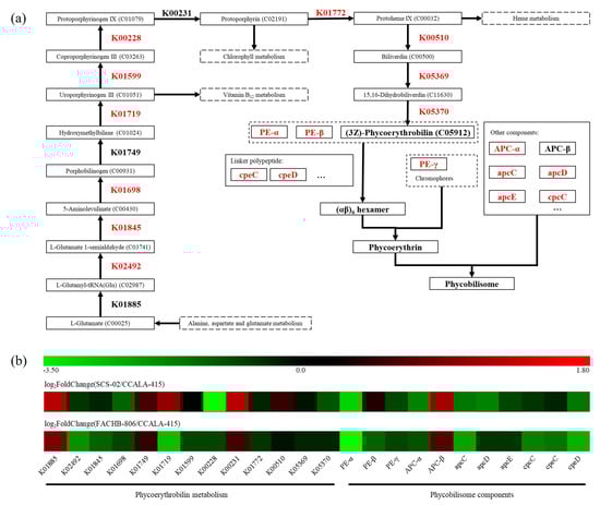 A total of 24 genes related to the synthesis of phycoerythrobilin and phycobilisome were annotated (Table 4). As shown in Figure 6a, L-glutamate derived from the alanine, aspartate and glutamate metabolic pathways was converted to (3Z)-phycoerythrobilin through 13 steps reaction. Subsequently, (3Z)-phycoerythrobilin underwent ring-opening reaction and then attached to the α and β subunits of phycoerythrin. The α, β and γ subunits of phycoerythrin carrying chromophores were linked by linker proteins to form active phycoerythrin. As shown in Figure 6b, SCS-02 had 20 down-regulated genes and 4 up-regulated genes compared to CCALA-415. According to the value of log2FoldChange, the genes, including K02492, K01719, PE-α, apcC and cpeD of CCALA-415, showed the higher expressional level than that of SCS-02. There were 17 down-regulated genes and 7 up-regulated genes found in FACHB-806. The genes with the value of log2FoldChange greater than two included K00228 and PE-α. In summary, the phycoerythrin synthesis-related genes of CCALA-415 were generally up-regulated compared to those of SCS-02 and FACHB-806.