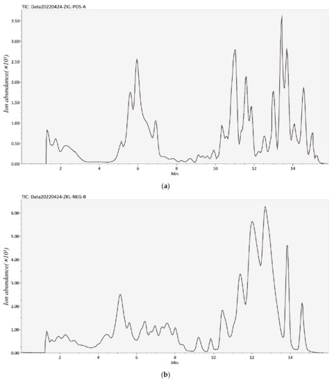 Base peak intestine chromatograms of RSE in positive ion mode (a) and negative ion mode (b).