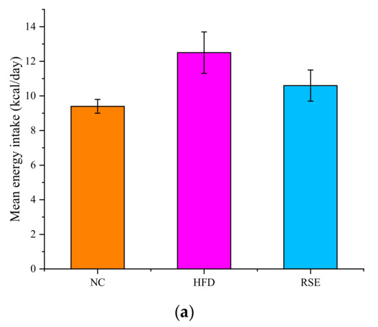 As shown in Figure 2a, the impact of RSE on the above obesity parameters was not attributed to reduced energy intake but primarily due to RSE intervention since no significant difference was found in energy intake between all the groups (Figure 2a). As shown in Figure 2b, there were no significant differences in the initial body weight of mice among the three groups. However, after 3 weeks of intervention, mice fed with HFD had higher body weight (Figure 2b) and epididymal fat index (Table 2) and developed hallmark features of dyslipidemia, including elevated TC (Figure 2c), TG (Figure 2d), and LDL-c (Figure 2e) levels. The HDL-c levels had no differences among the groups. Intervention with RSE significantly attenuated HFD-induced overweight, epididymal fat index, and serum TC, TG, and LDL-c levels of obese mice (p < 0.01).