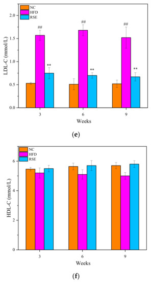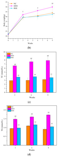 RSE prevented high-fat-diet-induced obesity. (a) Mean energy intake per mouse per day. (b) Body weight changes during 9-week intervention. (c) Serum total cholesterol (TC) level. (d) Serum triglyceride (TG) level. (e) Serum low-density lipoprotein cholesterol (LDL-C) level. (f) Serum high-density lipoprotein cholesterol (HDL-C) level. Data are expressed as the mean ± SEM. # p < 0.05 and ## p < 0.01 for NC vs. HFD; * p < 0.05 and ** p < 0.01 for RSE vs. HFD. NC, the normal chow group; HFD, the high-fat-diet group; RSE, the RSE treatment group.