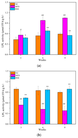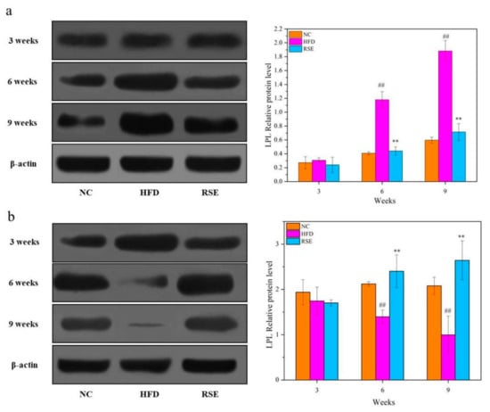 Figure 4 indicates the effect of RSE interventions on LPL protein expression in different tissues, respectively. Notably, LPL protein level increased significantly in adipose tissue in response to HFD treatment, while it was reduced in skeletal muscle under HFD (p < 0.01). Additionally, the LPL protein expression showed time-dependency in adipose or skeletal muscle tissues in HFD group. As expected, after 9 weeks of RSE treatment, the LPL protein level markedly decreased in adipose tissue (p < 0.01, Figure 4a) and significantly increased in skeletal muscle (p < 0.01, Figure 4b).