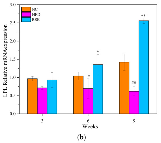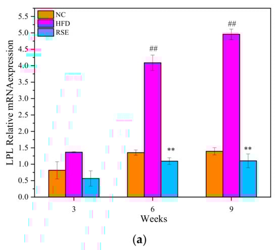 As shown in Figure 5, LPL mRNA levels were found to be significantly increased in epididymal adipose tissue, whereas it significantly decreased in skeletal muscle after HFD treatment for 6 weeks (p < 0.01). The intervention of RSE significantly reduced the LPL mRNA expression in the epididymal adipose of mice fed HFD (p < 0.01). Besides, RSE treatment increased the LPL mRNA expression in skeletal muscle by 4.3-fold as compared with the HFD group.