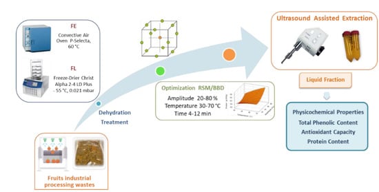 The optimized ultrasound-assisted extraction of fruit industrial processing waste previously subjected to two dehydration treatments was carried out following the general overview displayed in Figure 1. The impact of the extraction temperature and time as well as the ultrasound amplitude was successfully evaluated according to a Box– Behnken experimental design. The separated soluble fractions were individually and jointly evaluated for yield, protein, total phenolic content, and antioxidant capacity with promising results.