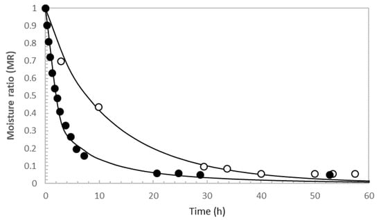 Two dehydration methods were tested in order to determine their impact on the bioactive properties of the recovered extracts from fruit industrial processing waste. Conventional drying was conducted in a convective air oven (P-Selecta, Barcelona, Spain) at 60 °C until constant weight following the corresponding drying kinetics, and samples were labelled FE. Freeze-drying was carried out in a freeze-drier (Alpha 2–5 LD plus, Martin Christ, Germany) operating at −55 °C, 0.021 mbar, and samples were labelled FL. In both cases, micronized samples were stored at room temperature in the dark in airtight plastic bags until further analysis. The drying kinetics of both processes were determined as moisture ratio (MR = (Mt − Me)/(M0 − Me)) versus time, with M0 and Me being the initial and equilibrium moisture content (kg water/kg dry basis, d.b.), respectively, and Mt the moisture content at any dehydration time. The corresponding drying kinetics were modeled using the well-known Page model [] (), where k and n are the two model parameters.