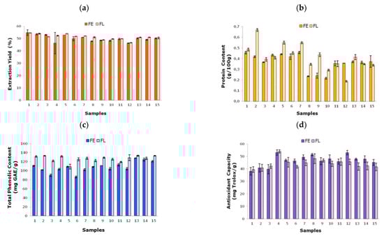 Experimental data of soluble extracts obtained after ultrasound-assisted extraction under different processing conditions (Table 1) for FE and FL samples: (a) yield, (b) protein content, (c) total phenolic content and (d) antioxidant capacity.