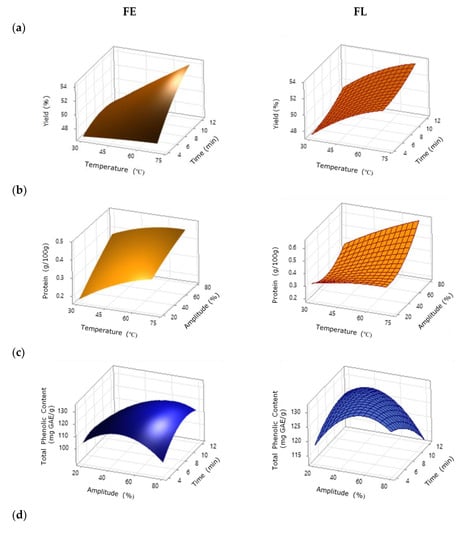 The selected response surface curves plotted in Figure 4b present the behavior of the protein content according to changes in the temperature and amplitude at fixed durations (8 min). For both FE and FL samples, higher temperatures and amplitudes suggested a higher protein content. The maximum value for the protein content (g/100 g) predicted by the model for FE (around 0.49) was observed under the conditions of 20% amplitude, 70˚C, and 12 min, whereas the model provided a maximum protein content (about 0.69) at 80% amplitude, 70 °C, and 4 min for FL.