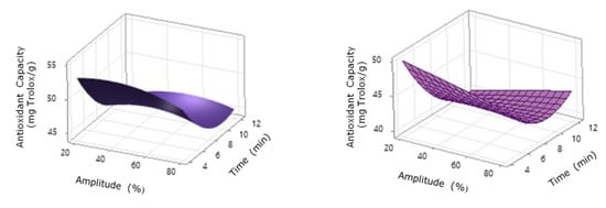 Figure 4d displays the corresponding response surface curves for the FE and FL systems. For both systems, a shorter extraction duration led to higher antioxidant capacity values at any amplitude, except for FL samples at amplitude values lower than 40%. The maximum antioxidant capacity predicted by the model for FE samples (53.66 mg Trolox/g) was observed under the conditions of 36.36% amplitude, 45.35 °C, and 4 min, whereas the maximum value for FL samples (54.40 mg Trolox/g) was predicted at 20% amplitude, 70 °C, and 4 min.