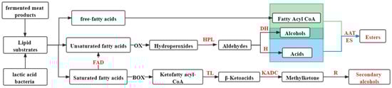 During the fermentation process of meat products, fat produces free-fatty acids and aldehyde and ketone flavor substances under the action of lipase, and its metabolic products can provide a carbon source for LAB to further produce other flavoring substances. The metabolism of flavor substances through LAB is depicted in Figure 2.