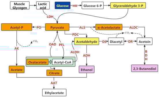 The specific pathways for the metabolism of sugars and the production of flavor substances by LAB are shown in Figure 3. During the transition from muscle to edible meat after the animal is slaughtered, lactic acid is produced from muscle glycogen during the glycolytic reaction. LAB in the skeletal muscles use glucose to convert to pyruvate during the fermentation process, and pyruvate is produced through the action of various enzymes such as lactate dehydrogenase, acetolactate dehydrogenase, and diacetyl synthase to produce esters with aromas such as acetate and formate and substances with a special flavor such as lactic acid, ethyl coupling, diacetyl, and acetic acid; acetic acid can also be used as a precursor substance for the flavor ester ethyl acetate [64,65,66]. The metabolism of glucose through LAB is divided into homo- and hetero-lactic fermentation, and the fermentation process produces lactic acid, ethanol, and other substances that can lower the pH in the fermentation environment; thus, several LAB can respond to acid stress by regulating their metabolism. Fernandez et al. [67] found that in Lactobacillus bulgaricus under acid stress conditions, the pyruvate metabolic pathway could alter to produce fatty acids, which in turn act as the source of flavor substances and add characteristic flavor substances to the foods.
