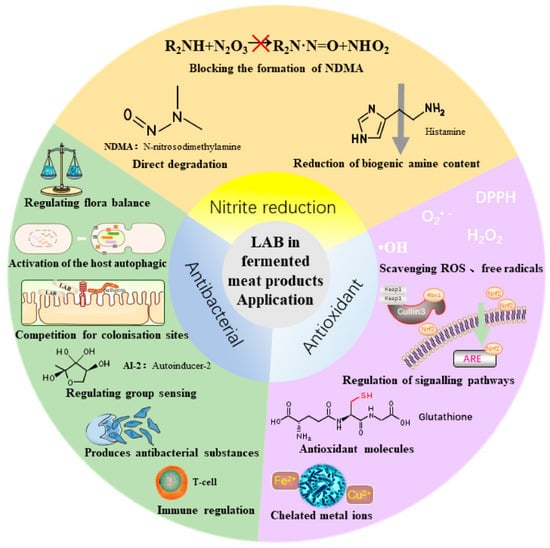 LAB are used in fermented meat products with functions such as antibacterial and antioxidant effects and nitrite degradation, and the main mechanism is shown in Figure 4. During the production of meat products to produce attractive colors, nitrite is usually added to protect the color, although there is a risk of cancer when the nitrite content is too high. The addition of LAB to meat products can reduce nitrite levels. During the storage period, meat products showcase a common fat oxidation and protein oxidation reaction; appropriate oxidation can add a special flavor to the product, although excessive oxidation produces unpleasant color and odor, resulting in the loss of nutritional value, shortening the shelf-life, and even producing toxic compounds [68]. LAB can slow down the oxidation of meat products through different antioxidant systems. In addition, LAB can produce antibacterial substances such as bacteriocins to prevent the spoilage of meat products and inhibit the growth of pathogenic bacteria.