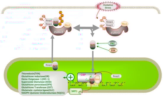 During the fermentation of food products, LAB produce small molecules of bioactive peptides and other components, which can exert antioxidant functions through the Keap1-Nrf2-ARE signaling pathway, as shown in Figure 5. In the normal state, Nrf2 in the cytoplasm is bound to its inhibitory protein Keap1. When stimulated through oxidation, the cysteine residues of the Keap1 protein are modified and Nrf2 passes through Keap1 before Nrf2 enters the nucleus, Nrf2 heterodimerizes with muscloaponeurotic fibrosarcoma protein (Maf) on CREB binding proteins (CREB) and binds to antioxidant response elements on DNA (ARE), inducing the expression of various antioxidant enzyme genes such as superoxide dismutase (SOD) and NADPH quinone dehydrogenase. When the cell returns to its normal physiological state, SIRT1 in the nucleus inhibits the Nrf2 expression, allowing Nrf2 to revert to the cytoplasm and maintain normal levels of Nrf2 through ubiquitination (Ub) degradation or negative feedback regulation [75,76]. In addition, protein kinase C (PKC) and extracellular signa-regulated kinase (ERK) are also involved in the regulation of the Nrf2 transcriptional activity by inducing Nrf2 phosphorylation.
