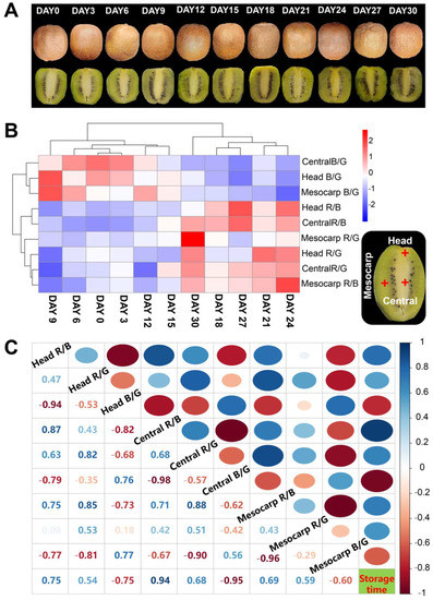 Figure 1. Appearance and flesh color of ‘Xuxiang’ kiwifruit changes during cold storage. Skin and longitudinal section of ‘Xuxiang’ kiwifruit stored at 2 °C for 1 month (A). Heatmaps of R/G, R/B and B/G values in different fruit sites (B). Correlation between R/G, R/B and B/G values in different fruit sites and storage times (C), where +1.0 and −1.0 represent stronger positive and negative correlations between the two features, respectively.