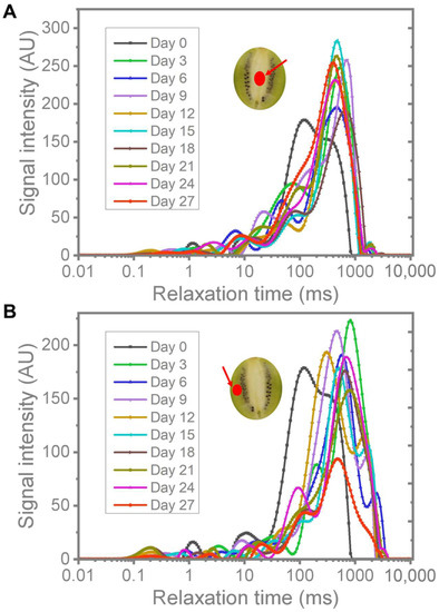 The transverse relaxation time (T2) reflects the chemical state of hydrogen protons in the interior of the samples, which is also related to their degree of freedom and tether force [39]. If the T2 is large, it indicates that hydrogen protons are bound to a lesser extent to other nonaqueous fractions, and the sample moisture is more likely to be lost. The continuous distribution of T2 for different parts of kiwifruit is presented in Figure 3. According to the T2, the fitted continuous exponential curves could be roughly divided into three parts: T21 (0.01–10 ms), T22 (10–100 ms) and T23 (100–10,000 ms). The areas of these three components represent the contents of tightly bound, softly bound and free water, respectively [40]. For the central and mesocarp sites of kiwifruit, the relaxation peak of T23 on other sampling days shifted to the right compared to day 0, indicating that the water activity increased during postharvest storage at low temperature. However, the relative content of free water increased first, then decreased as the storage time proceeded. This increase in free water might be related to kiwifruit at the ripening stage, whereas the reason for the decrease might be water evaporation of fruit. In the later stages of storage, the fusion of T22 and T23 peaks was observed, which is derived from severe cell damage leading to water migration from the vacuole to the cytoplasm, finally fusing and avoiding the separation of softly bound and free water [41].