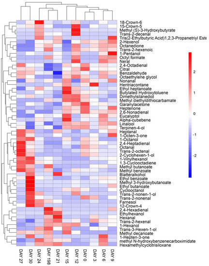 Figure 4. Heatmaps of volatile flavor compounds of ‘Xuxiang’ kiwifruit.