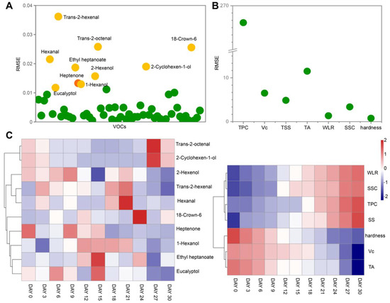Figure 6. The relations between VFCs—storage time (A) and quality indexes—storage time (B) were analyzed using the nonlinear least square fit method. Heatmaps analysis of the selected 10 VFCs and all quality indexes with the extension of storage time (C).