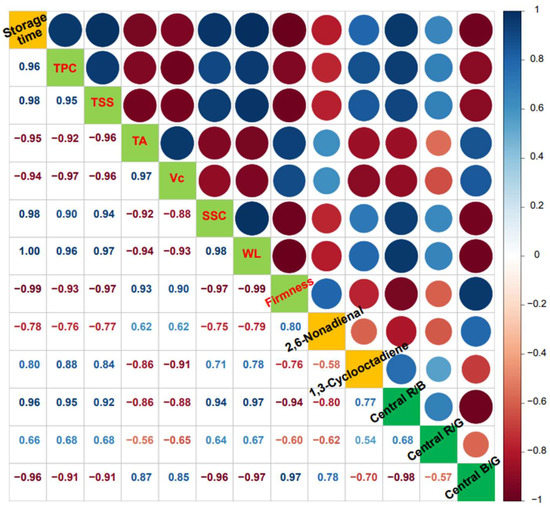 Figure 7. Correlation between all quality parameters, flesh color at the central site of kiwifruit and two VFCs selected with storage time.