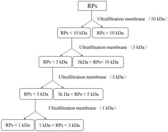 The crude protein (CP) concentration was analyzed according to AOAC procedure [21]. The concentration of neutral detergent fiber (NDF) was determined using the Ankom system (Ankom 220 fiber analyzer; ANKOM Technology Corp, Macedon, NY, USA). The concentration of glucosinolate was determined by the anthrone colorimetry [22]. The concentration of soluble peptides was determined by the Folin phenol method [23]. The lactic acid content was determined by gas chromatography [24]. The determination of total phenolic content was based on the Folin–Denis method, and was conducted using a slightly modified method described by Laguna [25]. The phytic acid content was determined using the method described by Wheeler and Ferrel [26]. The surface morphology and microstructure were observed with a high-resolution field emission scanning electron microscope system using the secondary electron detector (SEM, Hitachi S-4300) (acceleration voltage, 5.0 kV; magnification, 5000×). The different fractions of the RPs were separated and collected by the ultrafiltration method. The molecular cut-off weights (MWCO) of the membranes used sequentially were 1, 3, 5 and 10 kDa, respectively. The material of the ultrafiltration membrane was Xampler laboratory-scale hollow fiber cartridges, and the styles of membrane (GE Healthcare Bio-Sciences Corp. Westborough, MA 01581, USA) were UFP-1-C-3M, UFP-3-C-4×2MA, UFP-5-C-4×2MA and UFP-10-C-4×2MA. The QuixStand system (QSM-03S, 564107-42) was equipped with a 1 L liter QixStand reservoir with a cap and downcomers without pumps, and was equipped with a pump (Watson-Marlow Bredel Pump, Falmouth Cornwall TR11 4RU England, SN: 0122406). The RPs were ultrafiltrated at a trans-membrane pressure (TMP) of 150 kPa (45 °C) and at a volume reduction factor (VRF) of ½, and the selection of the condition relied on the SDS pattern of the retentate compartment. The specific procedure of the ultrafiltration was shown in Figure 2.